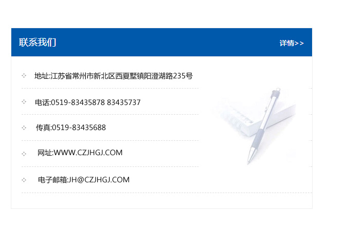 傳真:0519-83435688    郵編:213135    網址:WWW.czjhgj_com.nmscl.com    電子郵箱:JH@czjhgj_com.nmscl.com